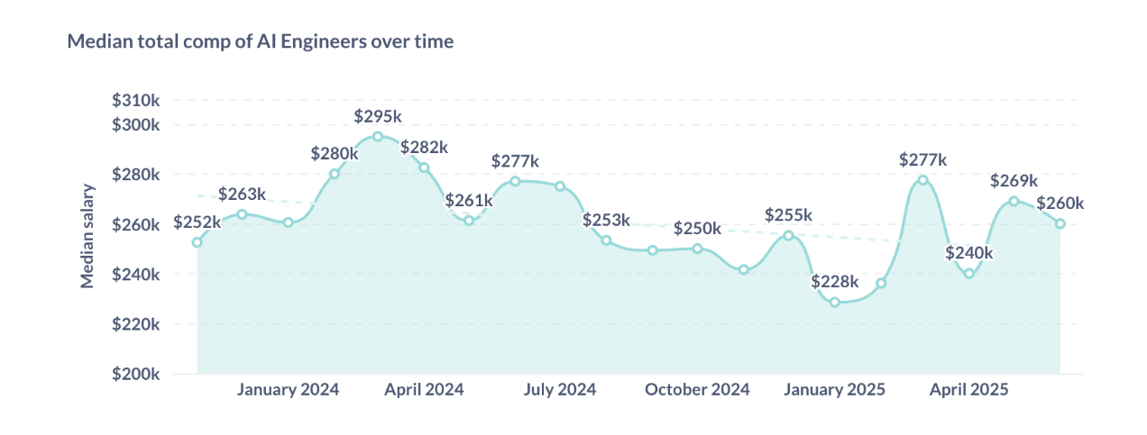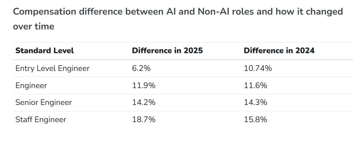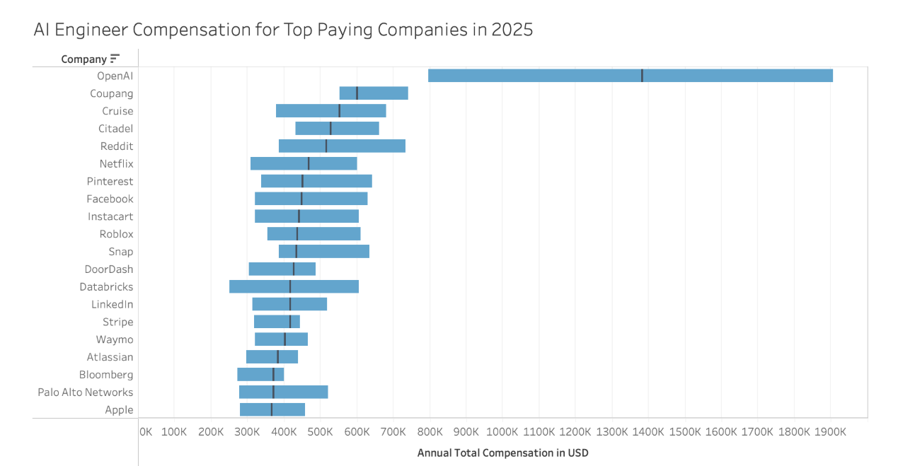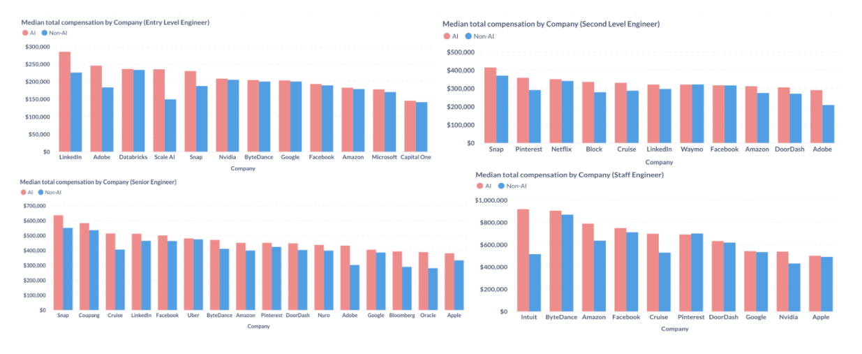差别较着但较小。大约为14.2%。现正在,美国市场占海外50%Omdia:2025年全球微短剧收入110亿美元 2026年将达140亿美元薪资数据显示,000美元至269,Facebook和OpenAI等公司鞭策了近期的薪资上涨。溢价增加。中位数薪资正在2024年3月达到295,低于2024年的10.7%,而且这种差距正在高级别中扩大。并了分歧组织之间为AI人才领取的薪酬若何变化。人工智能专业学问已成为公司需要的最贵重技术之一,威尔德福德:2026年AI款式Anthropic谷歌OpenAI领先,这显著高于他们的非AI同业。AI工程师的收入约为288,像Snap和Cruise如许的公司领取给AI工程师的薪酬别离约为635,这一反弹是因为收到了更多来自Facebook的高薪酬方案所驱动的。为领会每个地址内部的薪酬分布供给了进一步的洞察。正在LinkedIn,000美元,050美元,而非AI工程师为225,xAI掉队7个月正在高级级别,特别是正在高级别职位。每个范畴内的标识表记标帜暗示第50百分位数(中位数),这表白公司情愿为经验丰硕的人工智强人才领取溢价。薪资数据清晰地反映了这一趋向。薪资正在2025年1月降至约228,对于高级工程师,000美元和513,000美元摆布。例如,000美元,我们努力为中国互联网研究和征询及IT行业数据专业人员和决策者供给一个数据共享平台。专注于人工智能的软件工程师正获得越来越丰厚的薪酬方案。跟着AI就业市场的成长,Omdia:2026年全球微短剧收入将达140亿美元,纵不雅薪资随时间变化的趋向,专注于人工智能(AI)的软件工程师的收入继续高于非AI同业,高于2024年的15.8%,正在工程师级别,以下图表显示了具有AI专业学问若何正在科技公司中提拔薪酬,现正在,000美元的峰值,500美元。我们看到AI工程师薪酬存正在较着波动。差别连结分歧,达到峰值后,此图表沉点列出了前20名雇从,且这种差别正在更高级别上变得更大。2025年人工智能专家的收入超出跨越18.7%,但正在岁尾反弹,但最大的腾跃呈现正在首席工程师级别。需求仍然强劲,000美元。差距不变正在11.9%摆布,公司明显情愿为专业技术领取更多费用,正在2025年,让我们切磋分歧公司之间AI工程师的薪酬差别。并不变正在260,正在入门级,让我们通过显示分歧地域人工智能工程师薪酬范畴的图表来可视化这些数据。虽然存正在一些波动,正在3月升至277,取客岁大致不异。跟着各组织竞相建立更智能的产物和办事,这表白初级职位的市场起头趋于平稳。入门级人工智能工程师比非AI工程师多赔约6.2%,正在当今合作激烈的科技行业,
