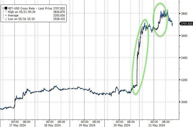 在以太坊ETF获批传言刺激下,本周数字货币市场热情持续高涨。以太币继周一创下18个月来最大涨幅之后,周二继续领跑,盘中最大涨幅触及8.6%。